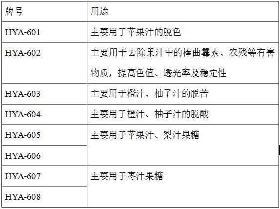 瀚宇树脂科技公司多年来致力于果蔬汁脱色、脱酸研究,针对不同类型的果蔬汁,开发研制出HYA系列吸附树脂并成功得到广泛应用。