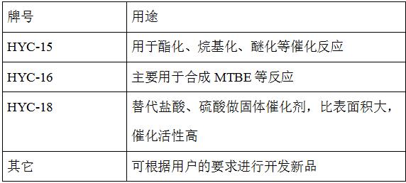 瀚宇树脂科技公司多年来致力于固体酸催化剂研究及应用,针对不同类型的合成工艺条件,开发研制出HYC系列专用催化树脂并成功得到广泛应用。